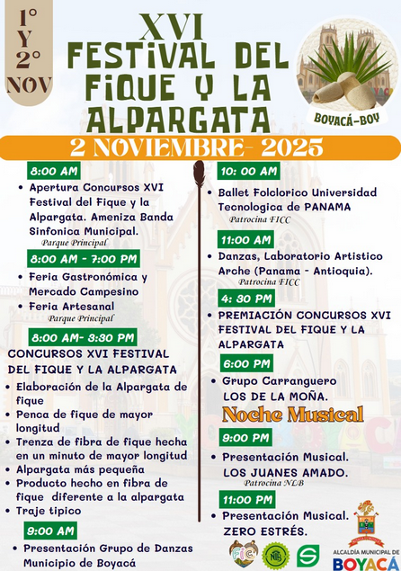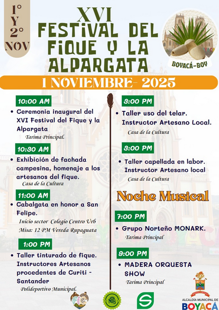 El 1 y 2 de noviembre, el municipio de Boyacá celebrará la décima sexta edición del Festival del Fique y la Alpargata, un evento organizado por la alcaldía que contará con una programación dedicada a las tradiciones campesinas locales.