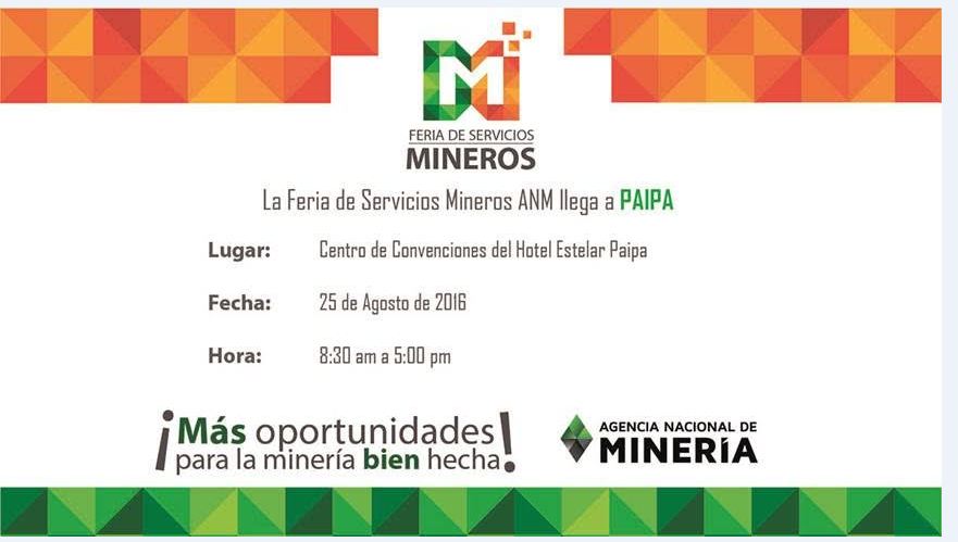 La Agencia Nacional de Minería está desarrollando la primera versión de las Ferias de Servicios Mineros, un evento que se llevará a cabo en nueve regiones del país, la próxima de ellas en Paipa, este jueves 25 de agosto.