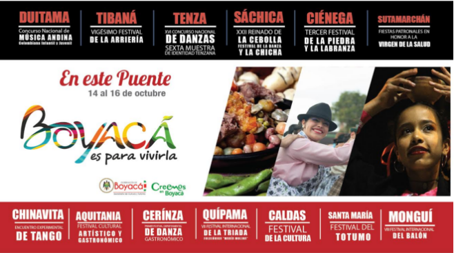 En Cerinza, 15 y culmina el 17, el Primer Festival de Danza y Gastronomía. En Caldas, del 16 al 17, el Festival de la Cultura y como si fuera poco, en Duitama se realizará del 15 al 16 de octubre, el Concurso Nacional de Música Andina Colombiana Infantil y Juvenil, 'Cacique Tundama'.
