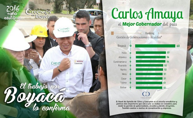 De acuerdo con el estudio realizado por la citada compañía entre junio y septiembre de 2016, el cual se denomina Panel de Opinión, el primer mandatario de los boyacenses, Carlos Andrés Amaya, se ubica en primer lugar con 60 de 100 puntos posibles.