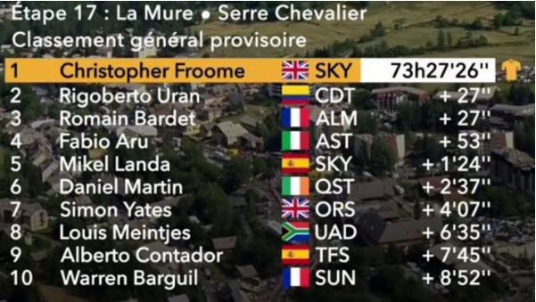 En un Tour tan ajustado, el ciclista del Cannondale consiguió ese segundo puesto por tan solo 4 centésimas con respecto al francés Romain Bardet. Los jueces de carrera tuvieron que ir a buscar esa diferencia a los tiempos tomados en la contrarreloj inaugural de Düsseldorf, y comprobaron que Urán está a 27 segundos y 82 centésimas del líder, el británico Chris Froome, mientras que el galo está a 27 segundos y 86 centésimas.