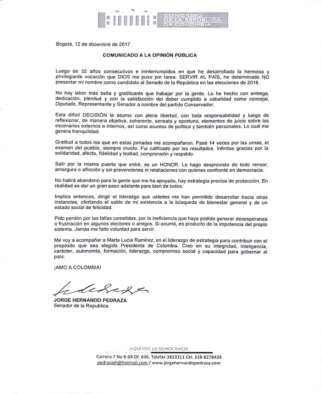 Jorge Hernando Pedraza Gutiérrez, confirmó a Boyacá radio.com su decisión de no participar en la elección al Senado de la República. La carta donde protocoliza su decisión la entregó en rueda de prensa realizada en el Senado de la República, luego de 32 años de política activa a través del voto popular.