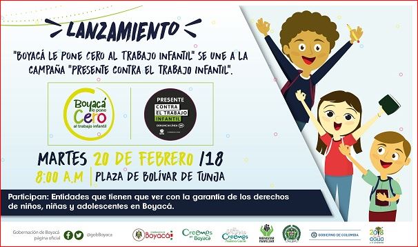 Los actores del Sistema Nacional de Bienestar Familiar, bajo la coordinacion del Instituto Colombiano de Bienestar Familiar, se vinculan estrechamente a la campaña: Presentes Contra el Trabajo Infantil', que se lanzará este martes 20 de febrero, en la plaza de Bolívar de Tunja.
