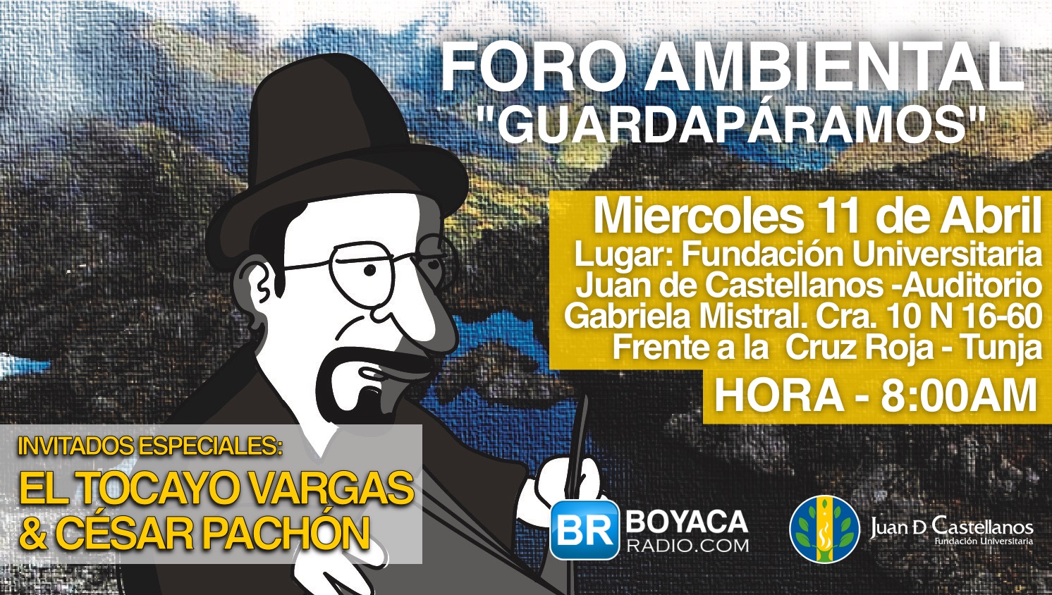Los Boyacenses están invitados a esta cita en la carrera 10 # 16-60, en frente de la Cruz Roja, en el auditorio, Gabriela Mistral, de la Fundación Universitaria Juan de Castellanos. En este evento también se contará con la participación Líder Campesino y recién electo Representante a la Cámara por Boyacá, César pachón, ademas de diferentes personas, considerados "guardapáramos" del departamento e importantes líderes campesinos.