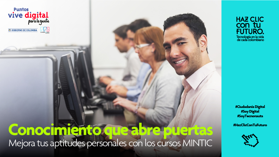 A través de un completo plan de formación en cursos TIC, enfocados en las necesidades e intereses de la población, se ha logrado que los colombianos adquieran habilidades y competencias que les permiten desarrollar proyectos educativos, de emprendimiento y empoderamiento en sus labores diarias y trabajar para mejorar las condiciones económicas y sociales de sus comunidades.