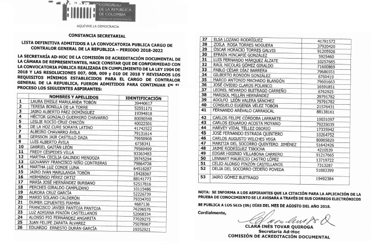 Lista de Aspirantes admitidos en Cámara de Representantes para Contralor General de la República