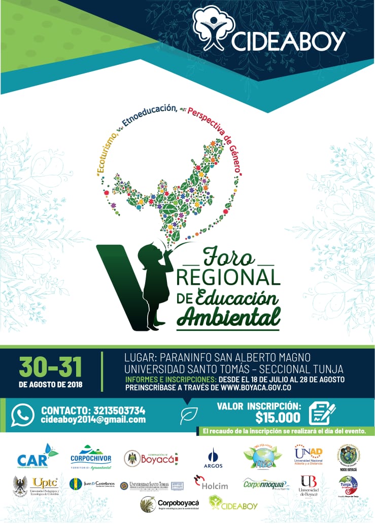 Este año, para el V Foro Regional de Educación Ambiental, programado para el 30 y 31 de agosto, el Comité Interinstitucional de Educación Ambiental de Boyacá definió tres temáticas para su realización: ecoturismo, etnoeducación y perspectiva de género, donde se contará con la participación de ponentes y expertos en cada una de estas líneas.