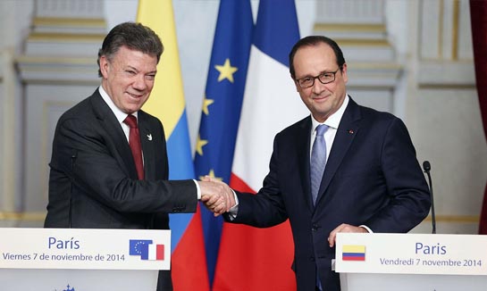 Como sucediera anteriormente en Madrid, Berlín, Bruselas y Lisboa, y antes de viajar a Londres, el presidente colombiano recibió en París el respaldo político al proceso de paz entablado con la guerrilla de las FARC y el compromiso de apoyar financieramente al país cuando supere el conflicto.