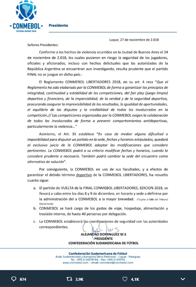 Ante las diferentes informaciones ue se han generado la Conmebol público un comunicado en el que cita 2 parágrafos n cuanto a las facultades que tienen para postergar y escoger las fechas horas y estadios de acuerdo a los inconvenientes que se puedan presentar en algunos torneos.