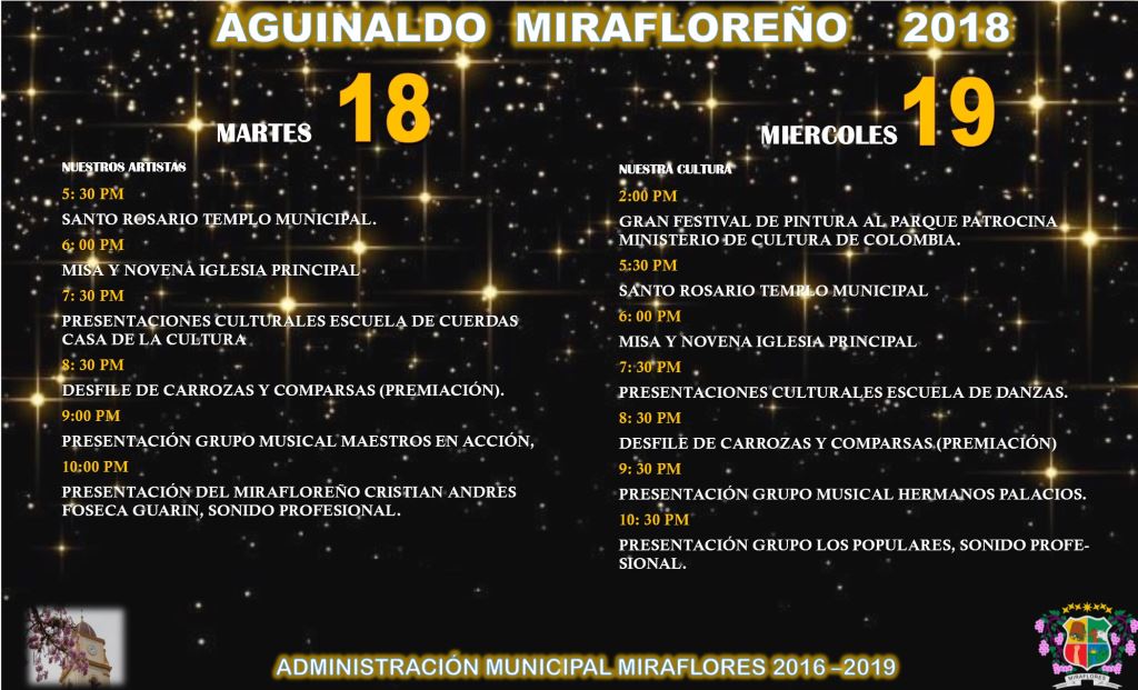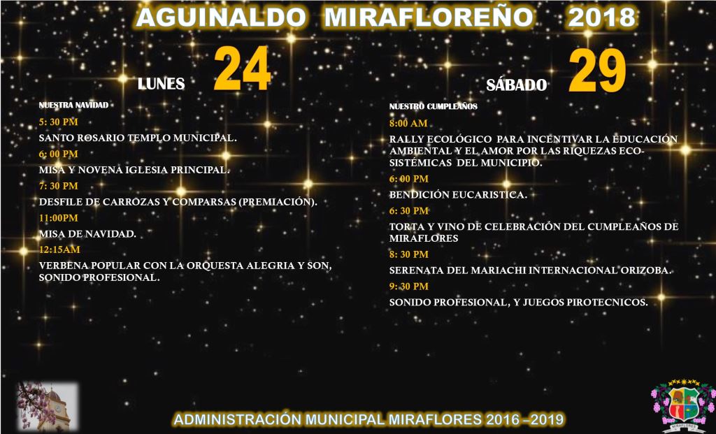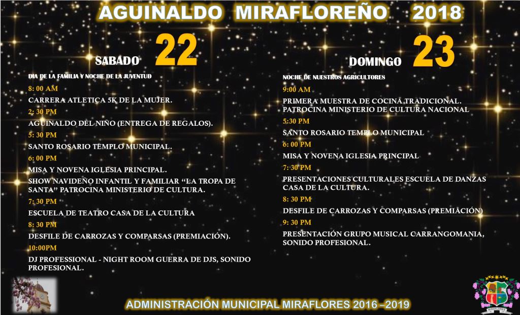 Del 16 al 31 de Diciembre propios y turistas vivirán por lo alto el Aguinaldo Mirafloreño 2018, gozando de la mejor gastronomía, concursos de carrozas y comparsas, eventos religiosos, concurso de luces, deporte, presentaciones culturales y verbenas.