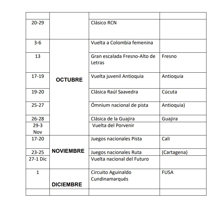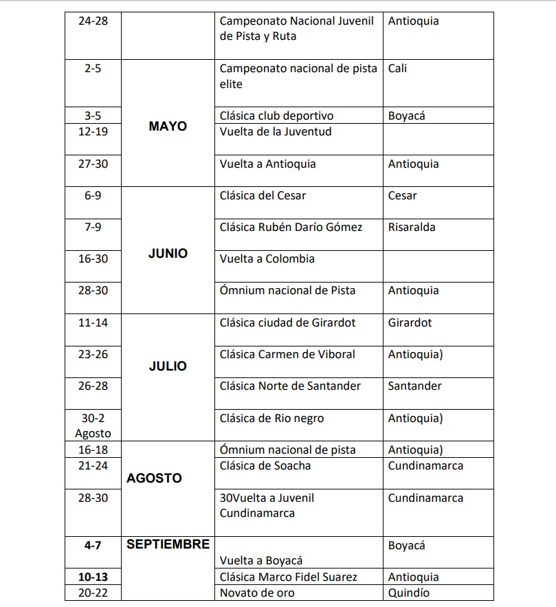 En el desarrollo de la Feria de Manizales se llevara a cabo la primera competición ciclística del año en Colombia el 7 de enero los manizalitas disfrutaran de lo mejor del ciclismo colombiano, las ruedas llegaran a Tuta Boyacá el 9de enero con el Circuito Miguel Sanabria para continuar en Antioquia con la Clásica Marinilla y culminar el mes de Enero en el Meta con el Campeonato Nacional de Ruta Elite y Sub 23 (Meta)