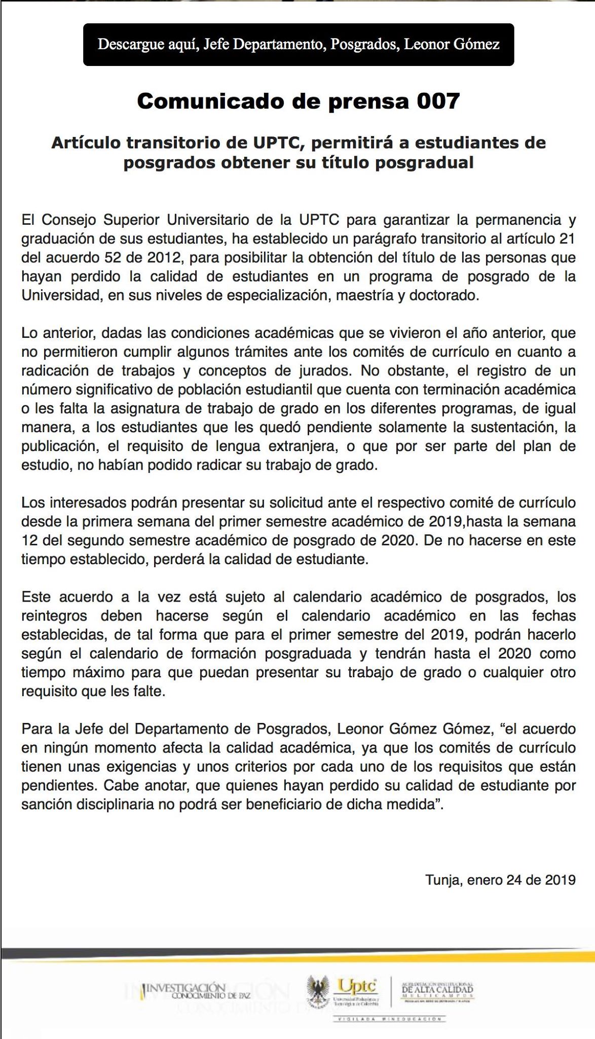 La universidad emitió ayer 24 de Enero de 2019 un comunicado de prensa en el que se afirma que se posibilita la obtención del titulo de las personas que hayan perdido la calidad de estudiantes en especialización, maestría y doctorado.