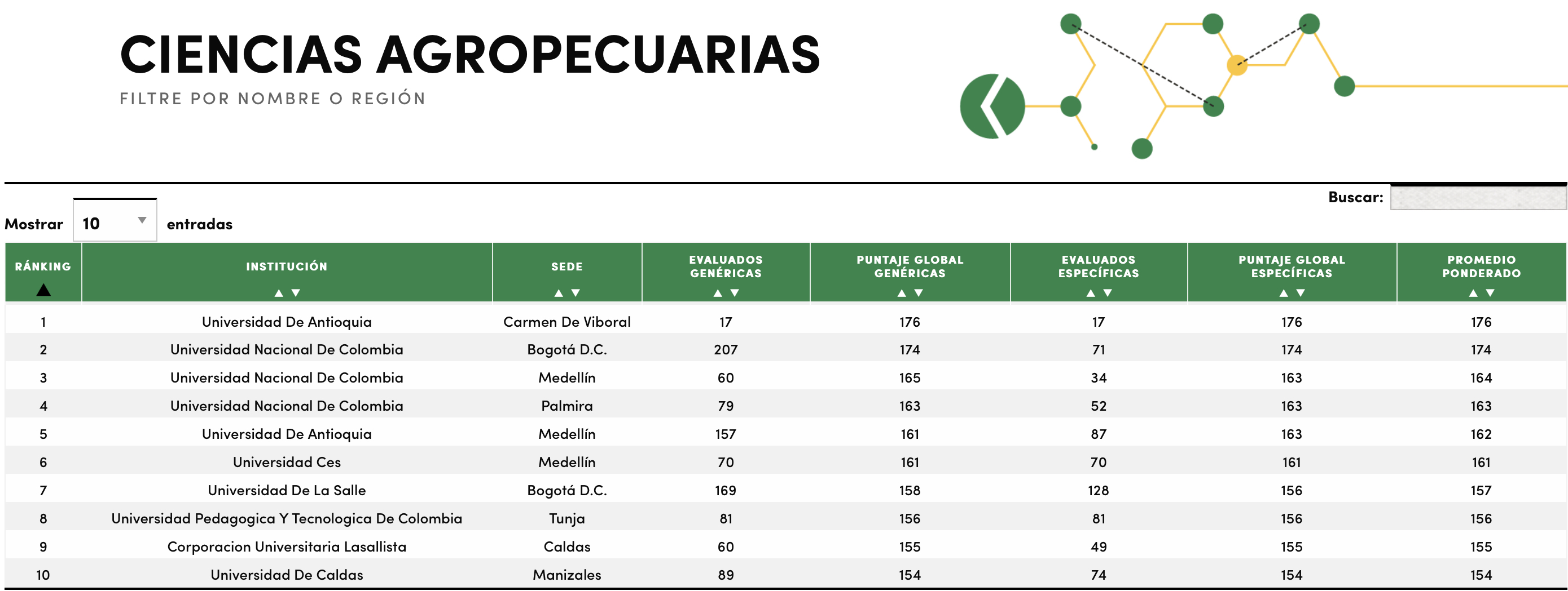 Para realizar la ponderación se excluyeron las universidades en las que se evaluaron menos de 5 alumnos, reunió el puntaje promedio global de cada universidad en su área y se definió el promedio ponderado con un 40% de peso en pruebas generales y 60% en pruebas específicas.