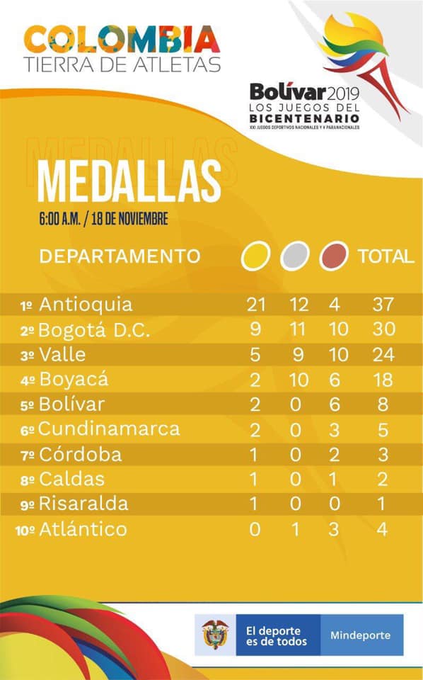 La tabla de medallería está comandada por Antioquía con 21 oros, 12 Platas y 4 bronces a los antioqueños le sigue la delegación de Bogotá y Valle en la tercera y cuarta posición respectivamente, por su parte Boyacá es cuarta con 2 oros,10 Platas Bronces.