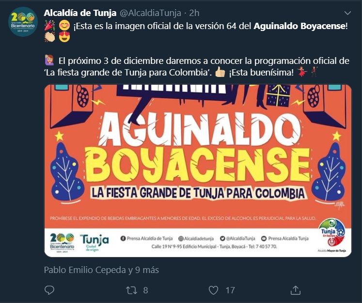A través de sus redes sociales la Alcaldía Mayor de Tunja dio a conocer la imagen oficial del Aguinaldo Boyacense en su versión 64, un diseño colorido de caricatura en el cual se evidencia en conjunto la cultura, la música, el arte, y la alegría de los tunjanos y boyacenses quienes serán los anfitriones de las festividades que darán inicio el 16 de diciembre hasta el 22 del mismo mes.