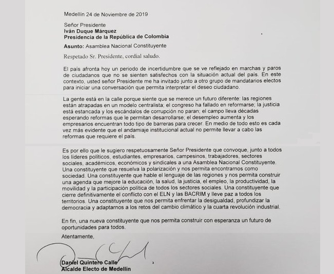 Daniel Quintero Calle, Alcalde electo de Medellín propuso ayer al presidente de Colombia, Iván Duque, convocar a una Asamblea Nacional Constituyente para solucionar los problemas coyunturales del país que han originado las marchas y paros en el país.