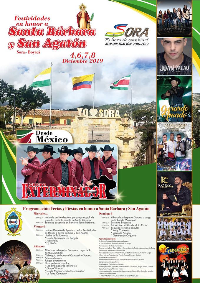 Del 04 al 08 de diciembre, el municipio de Sora vivirá Festividades en Honor a Santa Bárbara y San Agatón, con una extensa programación que abordará la música, gastronomía, eventos culturales y más.