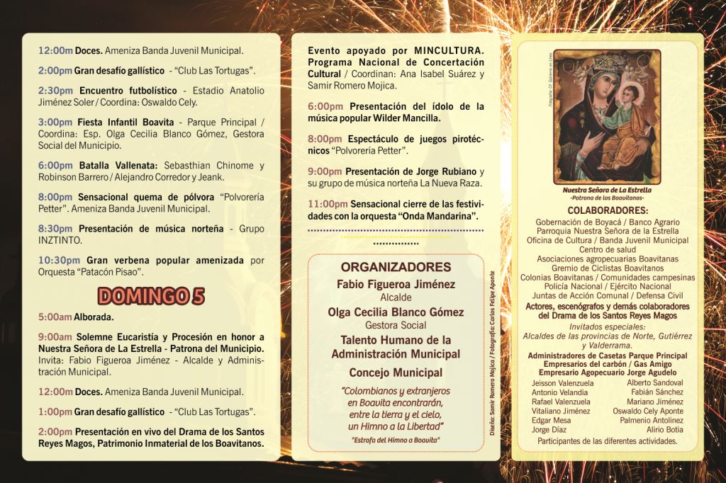 Desde hoy 02 de enero a las 12:00 m se dará inicio a las tradicionales Ferias y Fiestas con la celebración de los 434 años de Fundación. La celebración se extenderá por cuatro días en los que se vivirá una extensa programación con el propósito de atraer a los turistas y mantener las tradiciones de los boavitanos.