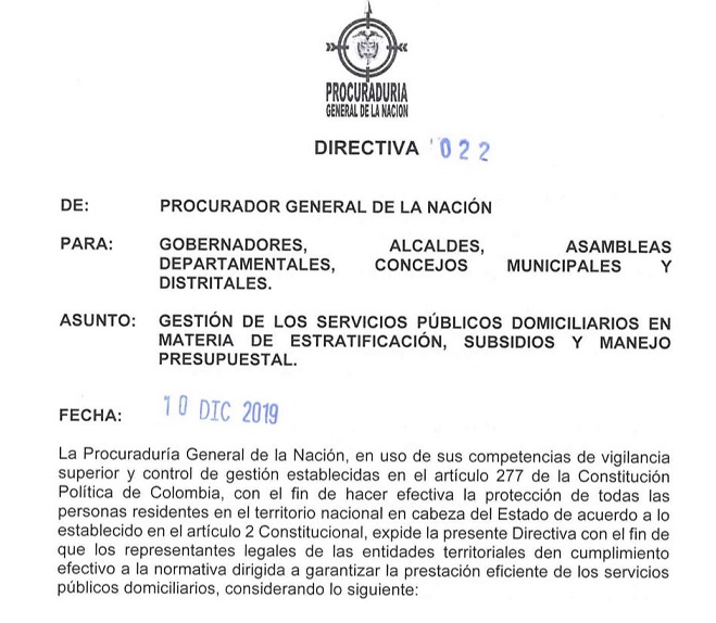 El jefe del ente de control a través de la Directiva 022 de 2019 alertó sobre las ineficiencias generadas por el incumplimiento en la prestación de estos servicios reflejadas en el ‘Informe Nacional de Monitoreo del Uso y Ejecución de los Recursos del Sistema General de Participaciones para Agua Potable y Saneamiento Básico SGP – APSB’ del año 2018 del Ministerio de Vivienda, Ciudad y Territorio.