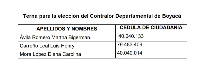 En consecuencia se conforma, en orden alfabético, la terna para la elección del Contralor Departamental de Boyacá, así: