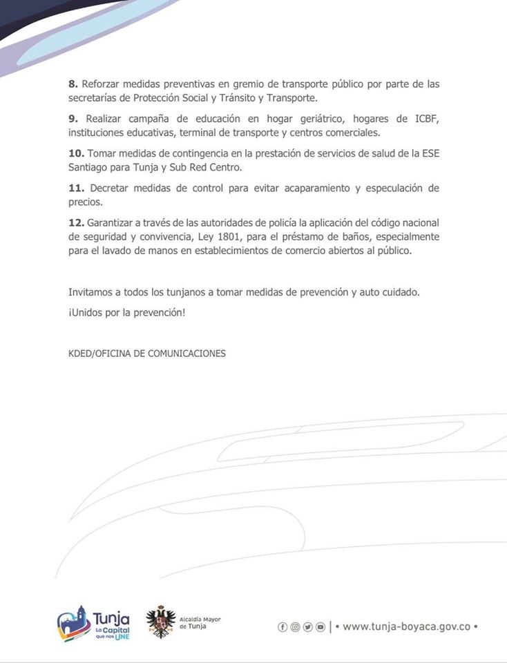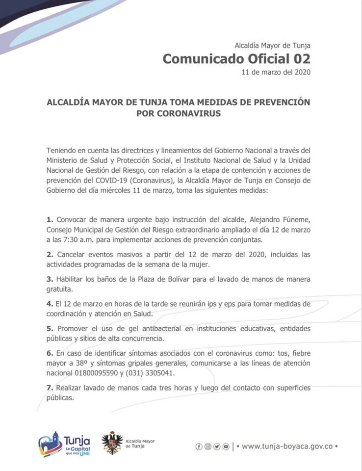 Luego del anuncio por parte de la OMS y las recomendaciones del Gobierno nacional en cabeza del Ministerio de Salud, la Alcaldía mayor de Tunja toma varias decisiones con el fin de colaborar en la etapa de contención y acción de prevención del covid19.