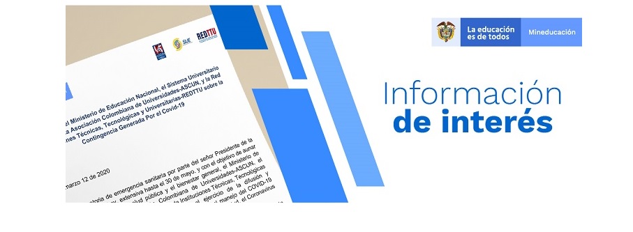 Ante la declaratoria de emergencia sanitaria por parte del señor Presidente de la República el día de hoy, extensiva hasta el 30 de mayo, y con el objetivo de aunar esfuerzos alrededor de la salud pública y el bienestar general, el Ministerio de Educación Nacional, la Asociación Colombiana de Universidades-ASCUN, el Sistema Universitario Estatal-SUE y la Red de Instituciones Técnicas, Tecnológicas y Universitarias-REDTTU, nos vinculamos en el ejercicio de la difusión y comunicación, para reiterar medidas preventivas sobre el manejo del COVID-19 declarada pandemia por la Organización Mundial de la Salud, el Coronavirus adquiere mayores proporciones en el mundo y ahora en nuestro país.