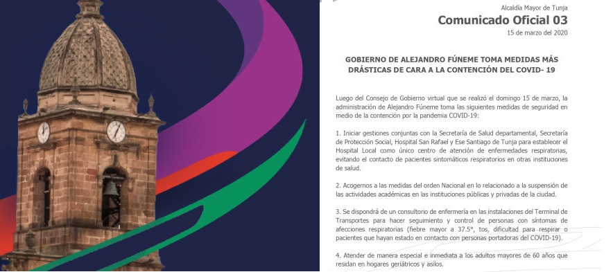 El alcalde puntualizó que para esta contingencia ninguna media es extrema, y aunque no existen casos confirmados en Boyacá, no se puede bajar la guardia dada la facilidad de contagio del virus. El alcalde dijo que al llegarse a registrar en Tunja el porcentaje estadístico mundial de contagio, y de no tomarse en serio estas medias, la propagación de la enfermedad exigiría la disponibilidad de 1.000 camas hospitalarias en tan solo unos días, cifra muy superior a la capacidad de camas de UCI en Tunja; hoy es de 43 y prácticamente se mantienen ocupadas con otros pacientes.