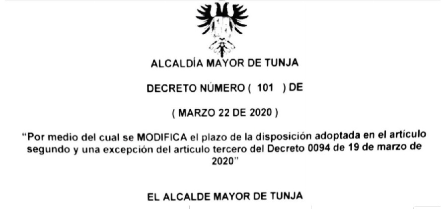 En este decreto 101 modificatorio al decreto 0094 de 2020, se establece "limitar la libre circulación de los habitantes del municipio de Tunja para lo cual se dispone el aislamiento en sus lugares de habitación a partir de las 20:00 horas del día 19 de Marzo hasta las 23.59 horas del día Martes 24 de Marzo de 2020".