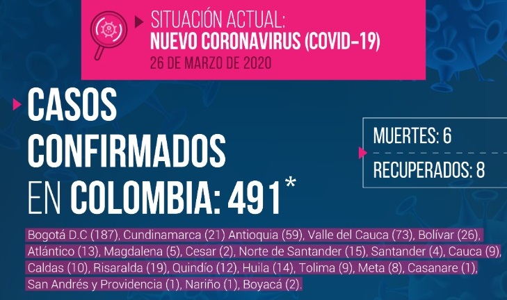 491 casos de coronavirus confirmados en Colombia, 2 en Boyacá. 6 muertos y 8 recuperados en Colombia