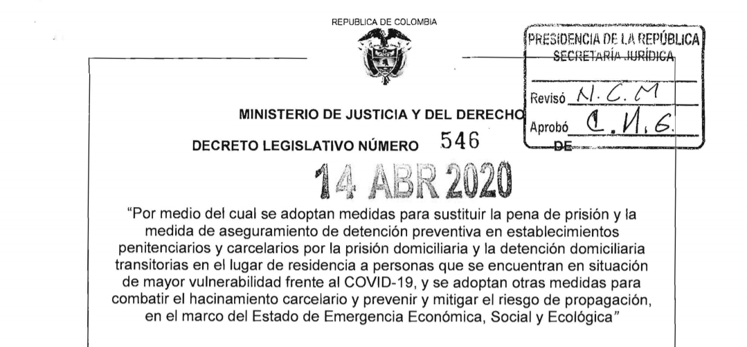 El decreto, por Covid 19, adopta medidas para sustituir la pena de prisión y la medida de aseguramiento de detención preventiva en establecimientos penitenciarios y carcelarios por la prisión domiciliaria y la detención domiciliaria transitorias en el lugar de residencia a personas que se encuentran en situación de mayor vulnerabilidad