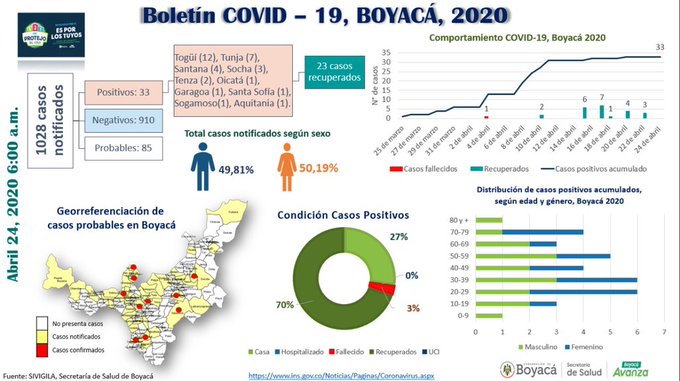 Más de 1000 casos encontrados sospechosos, de estos, 910 negativos y solo 33 positivos en Boyacá. El #covid-19 no ha desaparecido, lo que vemos es solo el resultado de la cuarentena! Mientras estemos confinados el virus no circula y no aparecerán masivamente nuevos contagios. pic.twitter.com/JoHr5qItig