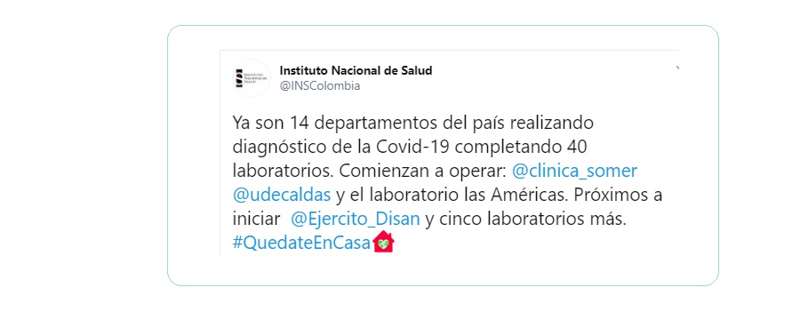 “Todos los departamentos de Colombia deben tener capacidad para diagnóstico de la covid-19 y pueden acudir a la Resolución 1619 de 2015, que les permite adscribir laboratorios externos, sea universidad, laboratorio privado o centro de investigación, cuando no cuenten con su laboratorio propio de salud pública a punto para la respuesta a este evento emergente o para aumentar capacidad”, afirmó la Directora del Instituto Nacional de Salud (INS), Martha Lucía Ospina.