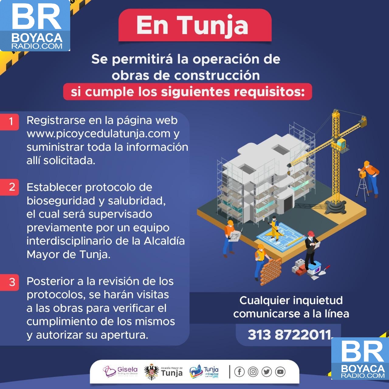 Luego de que se conocieran las nuevas medidas del Gobierno Nacional en cuanto ala reactivación de algunos sectores de la economía, el alcalde de Tunja, Alejandro Fúneme, determinó que esta debe hacerse de manera paulatina garantizando además de la seguridad de los trabajadores, la de la comunidad en general, para lo cual, las empresas constructoras y las del círculo de servicios asociados, deberán ceñirse a la resolución 00666 del mes de abril del 2020, emitida por el Ministerio de Salud y Protección Social - “Por medio de la cual se adopta el protocolo general de bioseguridad para mitigar, controlar y realizar el adecuado manejo de la