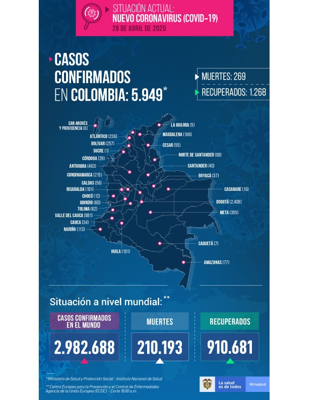 En Colombia 269 muertes; 5.949 casos confirmados y 1.268 recuperaciones
