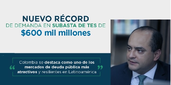 Subasta de TES por $600 mil millones marca nuevo récord de demanda. MinHacienda