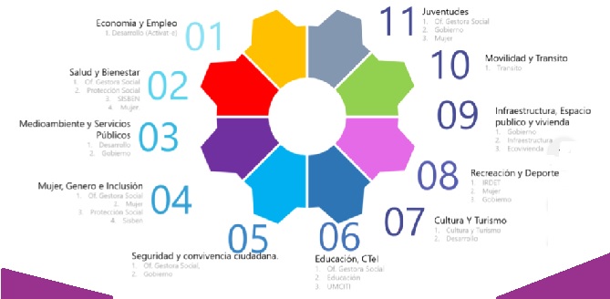 Cada uno de estos pilares contiene líneas temáticas específicas, tal como se ha hecho referencia en este texto y dentro de ellas se incorpora una parte diagnóstica que expone la caracterización del estado de cada uno de ellos, la estructura propositiva, las diferentes estrategias y las metas que se propone el Plan de Desarrollo , los objetivos y descripciones de cada meta.