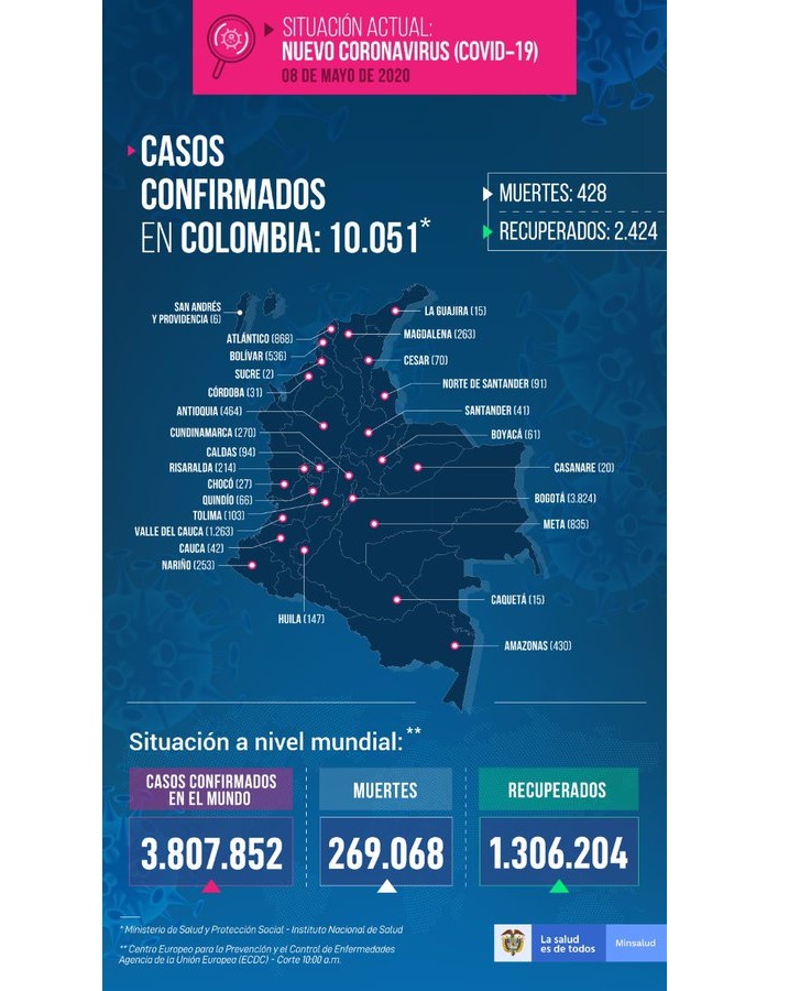 El Ministerio de Salud reportó para este 8 de mayo, en Colombia:124 recuperados, 595 nuevos casos y 21 fallecidos.