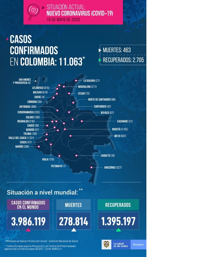 Las cifras totales hoy en Colombia son: 2.705 pacientes recuperados; 11.063 casos confirmados y 463 fallecimientos