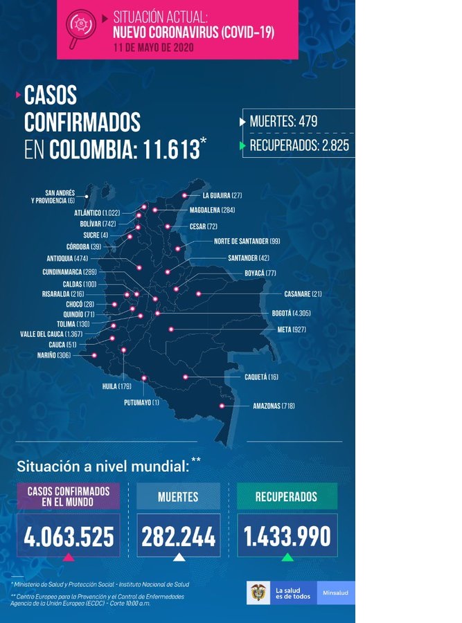 Para este 11 de mayo, confirmamos en Colombia 120 recuperados, 550 nuevos casos y 16 fallecidos. Así, las cifras totales son de:2.825 pacientes recuperados 11.613 casos de COVID-19 y 479 muertes