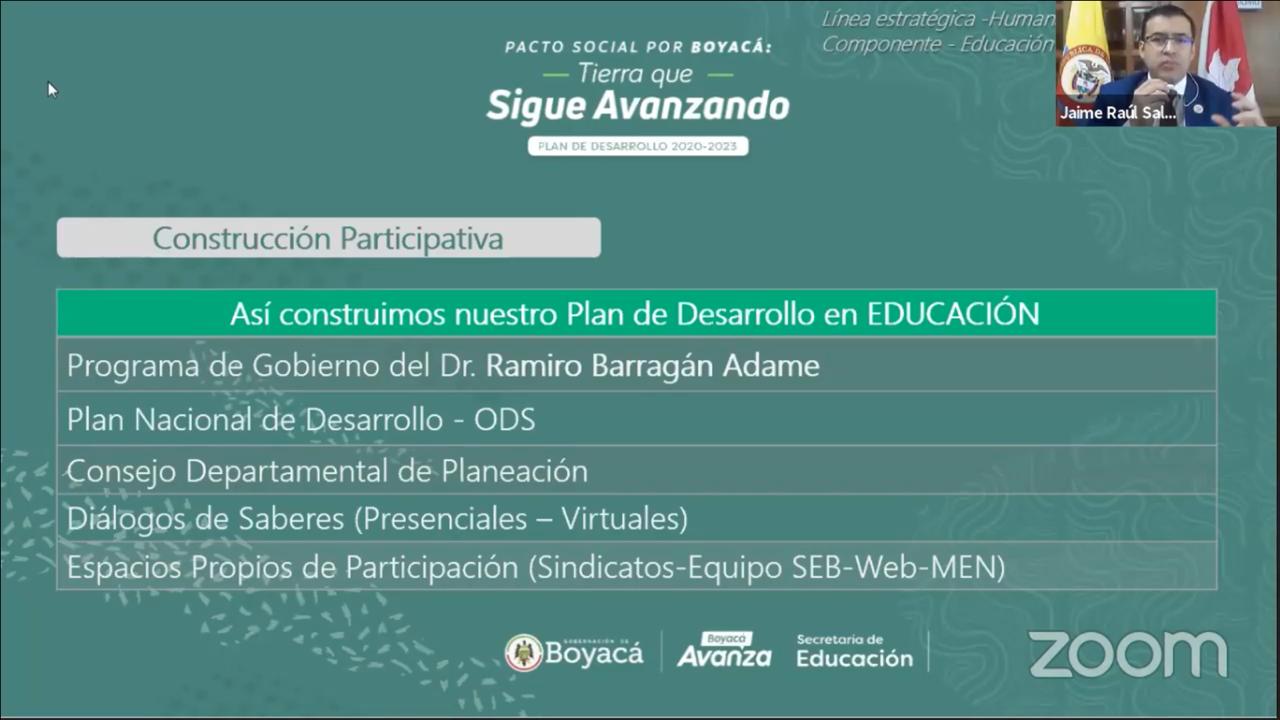 Un balance satisfactorio presentó el secretario de Educación, Jaime Raúl Salamanca Torres, luego de la primera sustentación del Plan de Desarrollo de Boyacá, 'Pacto Social por Boyacá: Tierra que Sigue Avanzando 2020 – 2023' de la administración del gobernador de Boyacá, Ramiro Barragán Adame, realizada en forma virtual, ante la Asamblea de Boyacá.