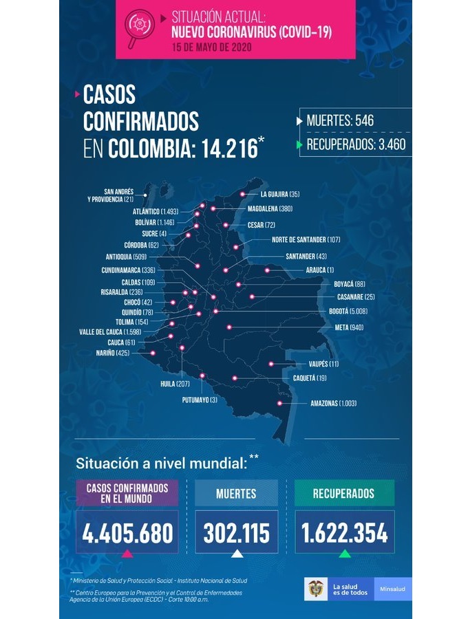 El Instituto Nacional de Salud reporta hoy 15 de Mayo 606 nuevos contagios y 21 fallecimientos para un total de 14.216 casos; 546 fallecidos y 3.460 recuperados