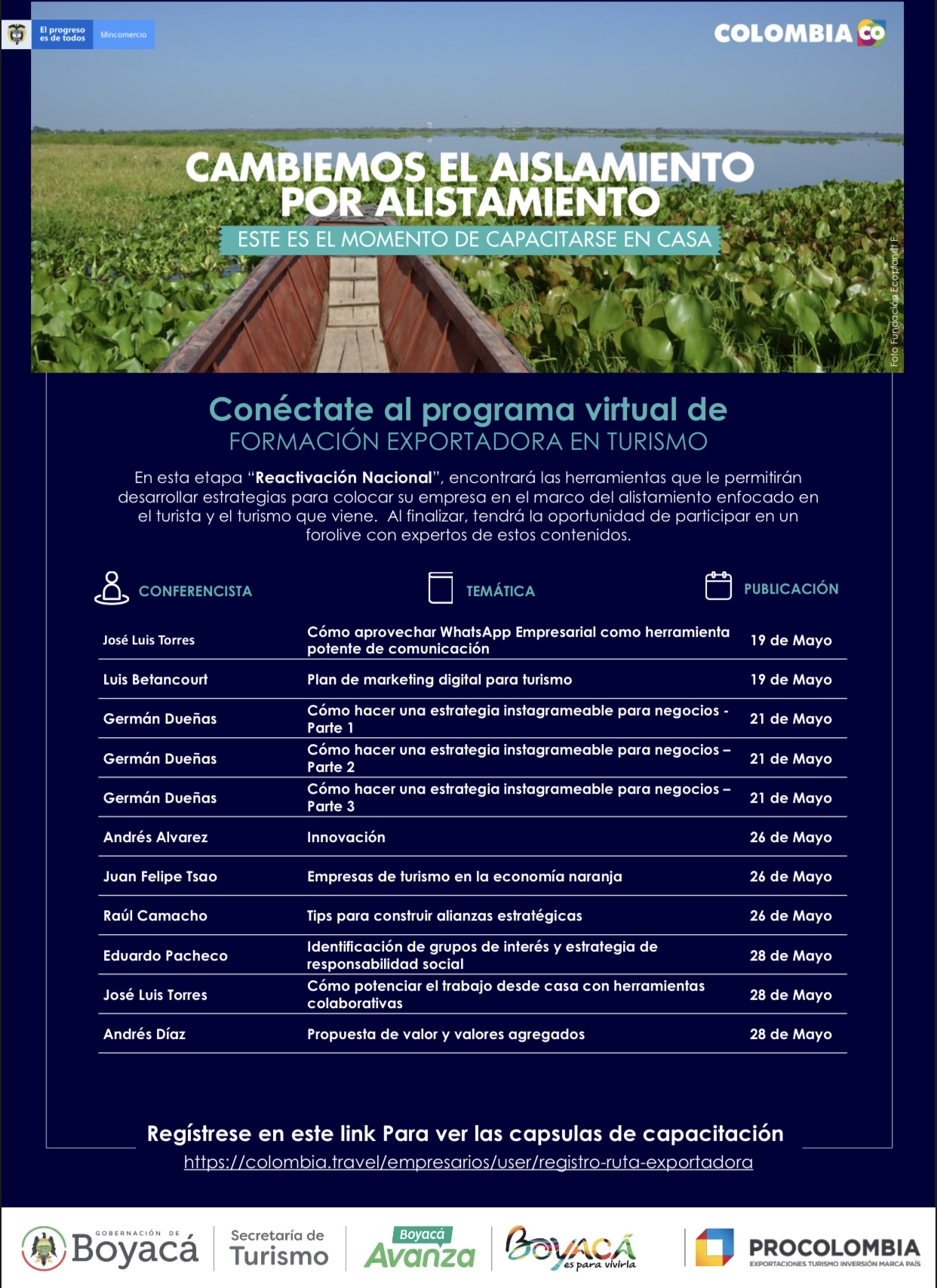 “En esta etapa de reactivación nacional, encontrará las herramientas que le permitirán desarrollar estrategias para ubicar a su empresa en el marco del alistamiento, enfocado en el turista y el turismo que viene”, menciona Procolombia en sus piezas de invitación.