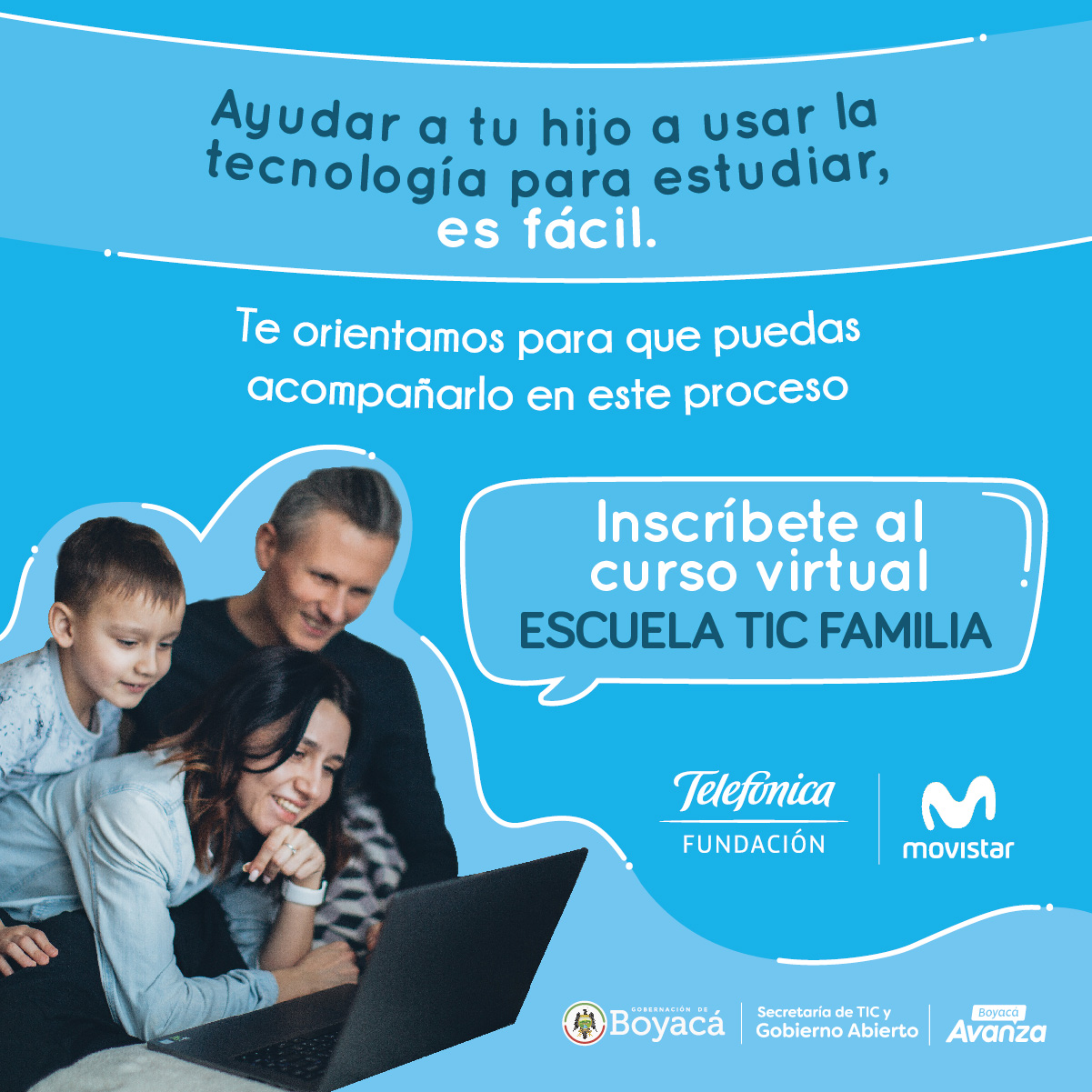 La Secretaría de TIC y Gobierno Abierto de Boyacá invita a todos los padres, madres y cuidadores de familia a capacitarse con el curso virtual ‘Escuela TIC Familia’ de ProFuturo programa de la Fundación Telefónica Movistar, que busca brindar orientación para el correcto acompañamiento del proceso educativo de la niñez haciendo uso de la tecnología.