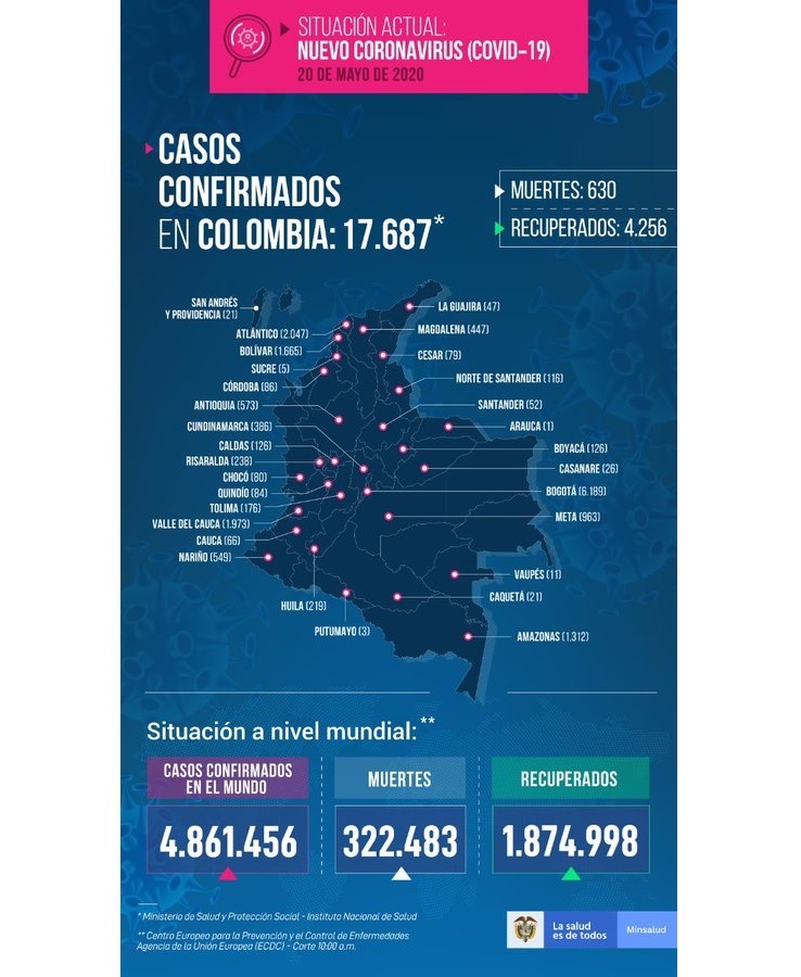 17.687 casos de covid 19 se registran a la fecha en total en Colombia, con 4.256 recuperaciones y 630 fallecimientos