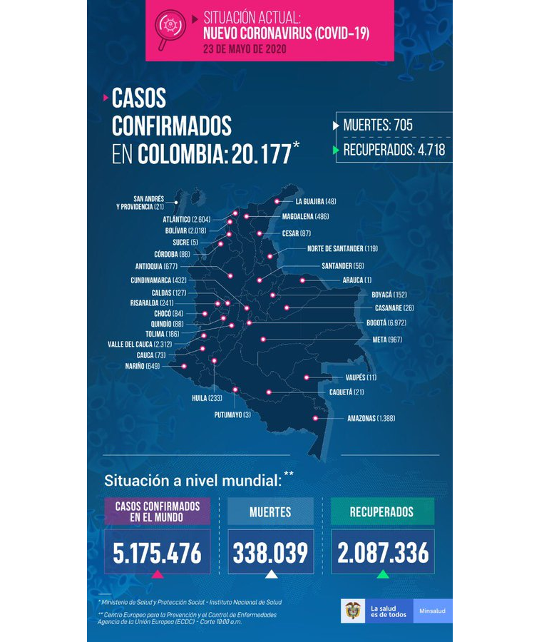 En total en Colombia se registran 4.718 pacientes recuperados 20.177 casos de COVID-19 y 705 muertes