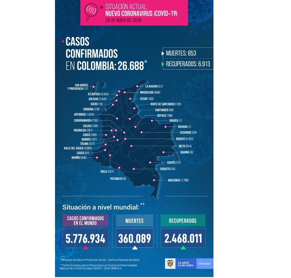 Se reportan en total en Colombia 6.913 pacientes recuperados 26.668 casos de COVID-19 y 853 muertes. Boyacá con 8 nuevos casos completa 190 contagios