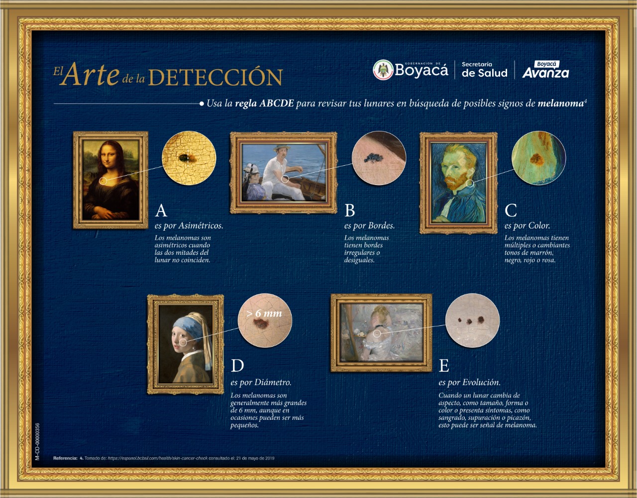 Agregó, que por esta razón, la Secretaría de Salud de Boyacá impulsa la estrategia “El Arte de la Detección”, que utiliza la regla ABCDE para revisar los lunares presentes en el cuerpo, en búsqueda de posibles signos de melanoma, que permitan la identificación temprana del cáncer de piel más agresivo y peligroso reportado.