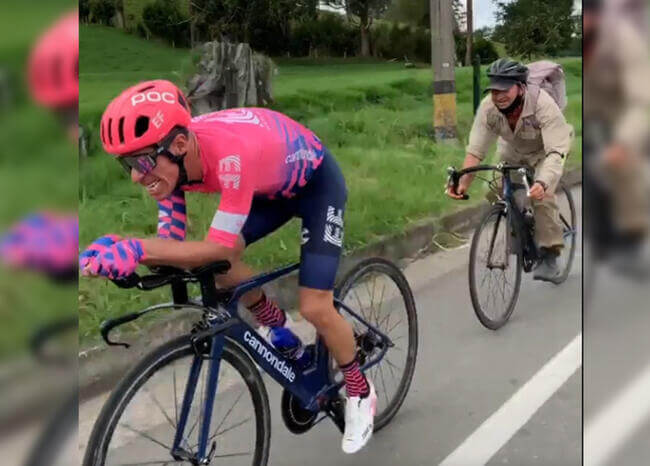 No es la primera vez que un ciclista colombiano se detiene en su entrenamiento y habla con un conciudadano que se le ha sumado al entrenamiento, y en esta ocasión le ha tocado a Rigoberto Urán.