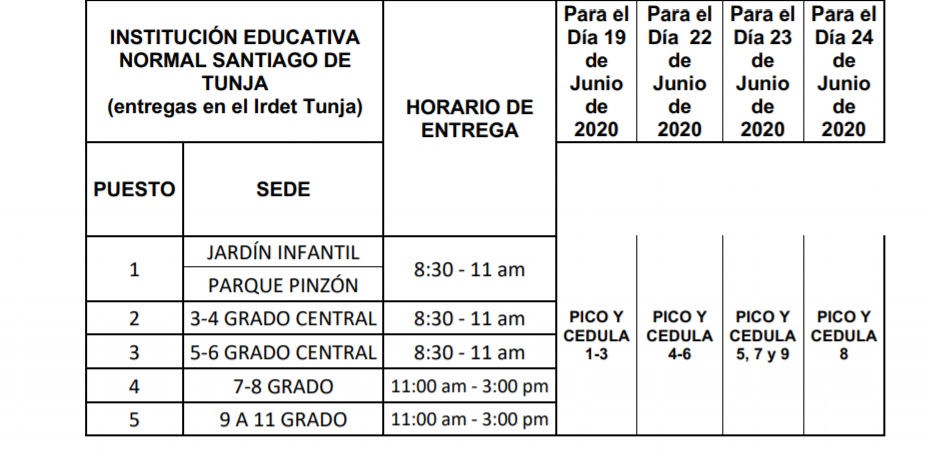 Las entregas para esta Institución educativa se realizarán desde ahora en el Coliseo Irdet, debido a las directrices de la UPTC al no permitir el ingreso de los padres y tutores de la Institución Educativa Normal Superior Santiago de Tunja a sus instalaciones para reclamar el paquete nutricional, ración para preparar en casa del PAE, la Administración Municipal ha determinado que, desde este viernes, 19 de junio, y por lo que queda de cronograma las entregas se realizarán en las instalaciones del Coliseo del Irdet de la siguiente manera: