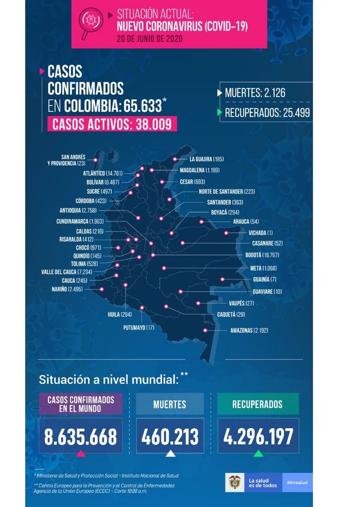 Las siguioentes son las cifras reportadas por el INS del total de casos en Colombia con su ubicación por departamentos y ciudades: